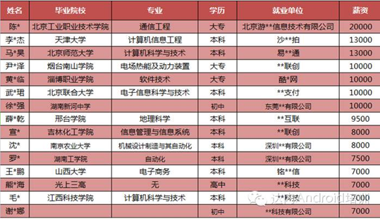目前在达内Android培优班学习的首批学员已经毕业了,并且呈上了就业喜报,数据显示:达内AndroidGSD1511A班毕业学员最高月薪资20000元,平均月薪资10500元,初中学历毕业学员月薪资7000元,高中学历毕业学员月薪资7000元。
