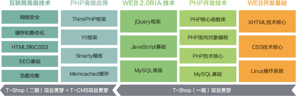 | 第六阶段:PHP 项目实践(T-Shop 项目、T-CMS 项目)课程持续 3.5 周,共 80 课时 | |||||